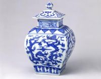 罐四方形,有盖。盖面饰如意云纹,罐颈饰回纹,肩部为蕉叶纹,腹部四面分别绘双云龙纹,足边为变形莲瓣纹。底青花双方栏内书“大明嘉靖年制”双行六字楷书款。