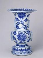 出戟尊仿铜器式样烧制,宋代钧、官二窑均有此类制品,明代青花承袭这一传统造型,自明中期至万历时期烧造数量大为增多,造型变化也最明显。
