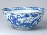 莲池纹在元代陶瓷器物上已经出现,明初永乐、宣德时将莲池纹与龙纹相结合,弘治时承继,并成为该时期最具代表性的纹饰题材之一。此碗釉白质润,纹饰线条纤细柔和,青花呈色蓝中微带灰色,是弘治青花中具代表性的器物