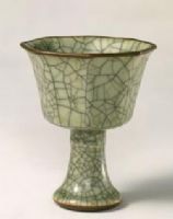 明代景德镇仿宋代哥窑瓷器始于宣德时期,此时,景德镇除烧制传统品种外,还创烧了许多新品种,仿哥窑瓷是其中之一。成化时期继承前制,并形成了自己的时代风尚。这件仿哥窑八方高足杯为成化时期新创品种,其形制玲珑俊秀,装饰典雅精美,富有成化器的特色。釉面虽仿宋代哥釉,但其釉质肥润,平整光亮,光泽度较强,故无宋哥窑的“酥润含蓄”之美。口、足釉色及金丝铁线纹也较宋哥窑片纹规整,少天成之趣。