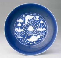 此盘器型规整,胎体厚重,蓝釉厚润莹亮,白釉鱼莲纹刻画得精美生动,既有天然意趣,又富装饰美感。鱼纹是我国传统的工艺装饰题材,由于“鱼”“余”谐音,因而民间有“连年有余(鱼)”、“宝贵有余”等吉