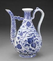 壶体为玉壶春瓶式,撇口,细颈,垂腹,圈足。一侧有弯形长柄,柄上有小系,另一侧附长流,流与颈间有云板相连。流、柄、口高低相若。壶盖扣合于壶口,盖面拱起,上饰宝珠钮,可与柄上的小系用绳相连以防壶盖滑落。通体青花为饰,颈部绘蕉叶纹,下饰缠枝莲花一周,腹部两面有菱形开光,一面开光内绘折枝桃,一面绘枇杷果,开光间绘缠枝花卉。盖面及近底处均绘莲瓣纹,流与足墙均饰忍冬纹,柄饰朵花纹。底白釉,无款。