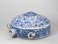 瓶直口,短颈,颈部凸起一周弦纹,一侧饰小系。腹体一面扁平无釉,中心凹进如脐,另一面隆起,中心凸出如半球状,肩两侧各有一活环耳。通体以青花装饰,口沿处绘缠枝花,腹部凸起处饰海水江崖地八角锦纹,内绘缠枝花,其外围饰缠枝花,瓶壁侧面饰海水江崖纹。青花色泽浓艳,纹饰流畅自然,极富动感。