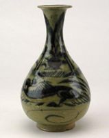 瓶撇口,细颈,垂腹,圈足。通体施青黄釉,外壁以青花绘蕉叶、莲瓣、鱼藻纹。