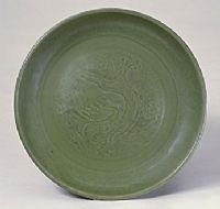 盘敞口,浅腹,坦底,圈足。里外施青釉,底部无釉,露胎处呈火石红色。盘心模印云龙纹,内壁刻划花纹。此盘器形较大,胎体厚重,釉呈青黄色,在较厚的釉层下模印的云龙纹清晰可见,据此表明这是元代龙泉窑青瓷的典型器。