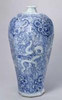 梅瓶胎骨厚重,小口平沿,颈细短。瓶身修长,有八棱。肩饰斜格锦纹,锦纹下一周大如意云头纹,内绘凤或麒麟穿牡丹图样,瓶身中部一周绘4条白龙,衬以青花海水和火焰纹,近足处饰一周如意云头纹,内绘牡丹花叶。