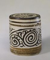 罐直口,直壁,平底,附嵌入式盖。外壁采用白地褐彩装饰,主题图案为缠枝卷草纹,盖面饰一折枝花卉纹。图案简捷流畅,自然大方。这种装饰技法缘于北方磁州窑,但又有吉州窑自身的特色。其底色与纹饰色彩的对比没有磁州窑强烈,即白地泛黄,黑花发褐。江西南昌南宋嘉定二年(1209年)墓出土的奔鹿纹盖罐等器物为此类瓷器的断代提供了依据。
