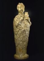 这是一尊宋代耀州窑烧造的青釉塑像,塑造一中等身材的伫立男像。其形像昂首挺胸,双目炯炯有神,平视前方,两腮微鼓,双唇紧闭,神态安详。头戴蝴蝶结饰物,身披由树叶缀连而成的长衣,左手托宝瓶,右手执草叶于胸前,腰间系一布带,赤足立于圆托上。通体罩青中略带黄色之釉。