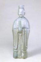 壶体造型为一男子,束冠,着长襟衣衫,双腿直立,微露双足。人躯体中空,头有孔为壶口,双手于胸前捧方口壶流,后背中央附曲柄。人物面部表情庄重肃穆。通体施青釉,釉色青绿,匀净滋润,因衣纹线条折角处釉薄呈现出胎色而具有立体效果。