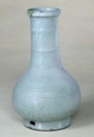 瓶洗口,长颈,圆腹,高圈足,圈足两侧各有一长方形扁孔可供穿带。颈至腹部凸起7道弦纹。通体施青釉,釉层肥厚。器身布满大片纹,纵横交错。此瓶仿汉代铜器式样,线条简洁雅致,凸起的弦纹改变了造型的单调感,增强了器物的装饰性。釉色给人以凝厚深沉的玉质美感,是宋代官窑瓷器的代表作品。