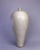 瓶小口折沿,短颈,丰肩,肩下渐收敛,圈足。俗称“梅瓶”。通体施白釉,釉色柔和洁净,白中闪黄。肩部刻菊瓣纹一周,腹部刻缠枝莲纹,下部刻上仰蕉叶纹,刻花清晰婉转,深浅不一,莲花简洁典雅,线条流畅,显示出定窑刻花技术的娴熟。此瓶造型挺拔,是宋代定窑梅瓶的标准式样。