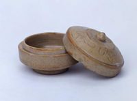 瓷盒在唐代已出现,南宋时各地瓷窑无不烧造,造型多样,有莲瓣盒、菊瓣盒、八方盒、瓜式盒等等,其用途多作为古代妇女梳妆的用具。此器小巧精致,刻花线条纤细圆润,奔放有力,寥寥数笔即刻划出一朵盛开的菊花,使素静的釉面增添了几许雅致的情趣。