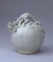 壶为瓜棱球形,一条堆塑其上的螭龙巧妙地形成壶流与提梁,平底,底中心有一注酒的圆洞。通体施青白釉,釉色白中泛青,莹碧剔透。此壶造型新颖别致,清新怡人。