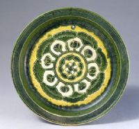 盘口为板沿式,平底,下承3足。通体以绿釉为地,盘心刻一团花,外环荷花、花蕾及荷叶纹,施以黄、绿、白三色。底无釉。