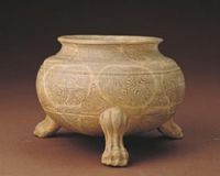 罐口外卷,圆腹,下承以三兽足。此罐通体绞胎,以两种颜色胎泥绞出木理纹样,并以团花形式表现,是绞胎器物中难得的佳作。
