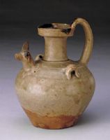 壶盘口,鸡首状短流,鼓腹,平底,俗称“鸡首壶”。肩部两侧有桥形系,并有一弧形柄连接口沿。通体施青釉,壶口与鸡首处点缀褐彩,有画龙点睛之妙。