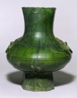 壶盘口,长颈,肩部置对称铺首耳,垂腹,腹下承以外撇高圈足。壶通体施低温铅绿釉,釉呈瓜皮绿色。口、颈、腹部均饰凸起的弦纹。