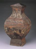 壶口部与足底皆为方形,四角攒尖方盖,壶身两侧各有一铺耳。通体饰以黑、红彩为主色调的图案,颈与腹部皆绘流云纹,并以菱格纹条带相间。