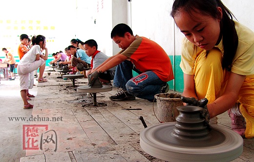 长期以来,德化各中小学立足于瓷都特色,把传统技艺引入课堂,开设瓷艺课程,开辟 “陶瓷艺术角”, 举办手拉坯制作比赛、“泥塑小能手”大赛、百米长卷绘瓷都等各项活动。此外还依托广博的瓷都文化,分别在一些企业及陶瓷博物馆等处建立校外陶瓷实践基地,取得了良好的教育效果。