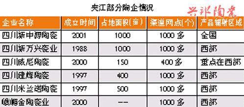 夹江97家建陶企业中产值过亿元的企业有6个,20多个主要陶瓷品牌也集中在这些企业中。然而,除了新中源陶瓷以外,其它陶瓷品牌销售市场主要集中在西南和西北。夹江政府则一直致力于区域品牌的打造,鼓励和引导企业建立自主品牌。而夹江的主流陶企也致力于品牌建设和全国市场的拓展。如新万兴的万茂陶瓷把专卖店开到北京、威尼陶瓷专卖店走进了上海市场。