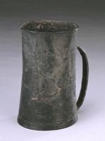 杯呈筒形,腹间微收,平底,杯身一侧有扁形把,便于持拿。杯为轮制而成,杯身均匀地分布三道弦纹。