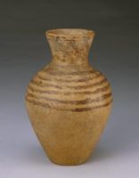 瓶陶质,敞口,束颈,鼓腹,腹下渐收,平底。器表光滑,上腹部彩绘弦纹六周,纹饰简洁明快,朴素大方,有很强的装饰性。此类弦纹是马家窑文化中马家窑类型彩陶的常见纹饰。