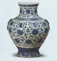 侈口,束颈,鼓腹,圈足。肩置铺首衔环耳,颈部饰缠枝宝相花,肩部饰八吉祥图案,腹下部绘仰莲瓣纹,口沿和圈足饰海水江牙,共八组纹饰组成整体画面。宝相花是一种具有象征意义的花,它集中了莲花、牡丹、菊花的特征,是经过艺术处理而成的更圣洁、更端庄、更美观的理想花型,它与八吉祥相配即寓意吉祥如意。此尊造型工整,画风古朴,青花颜色明快艳丽。