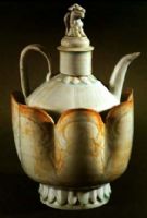 胎色白中微黄,釉色青白。注子小口,套盖,盖顶蹲一狮。腹呈六曲长流,带式曲柄。仰莲式碗,莲瓣边沿饰如意纹。圈足饰小莲瓣一周。构思巧妙,制作精致,是景德镇窑青白瓷中少见的佳作。南唐画家顾闳中所作《韩熙载夜宴图》,画了两件注子,形制与此基本相同