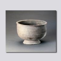 首都博物馆藏。泥质灰陶。仿青铜器造型,直口,深腹,圈足外撇。口沿下刻划兽面纹及回纹,下腹为蝉纹,刻划工整细腻,纹饰线条纤细有力。