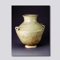 首都博物馆藏。敞口,短粗颈,斜肩,折腹,圈足,足内无釉。肩部贴有对称双系,并饰五组刻花弦纹。通体施青釉,釉色淡青,釉面不均匀,胎质坚硬,呈浅灰色。它作为瓷器,尚不够成熟,故称之为原始青瓷。