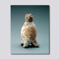 首都博物馆藏。泥质灰陶。鸮形,头为尊盖,双目圆睁,嘴为钩形。两爪及尾部鼎立而成三足。通体施黄釉,尊两侧刻划出羽毛,为鸮的翅膀。