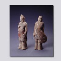 首都博物馆藏。左:高23厘米。泥质灰陶。上有白陶衣,有红彩。明器。头戴武冠,敛下颌,上身内穿紧身宽袖衫(褶衣),外披裲裆铠,铠上有鱼鳞形甲片、上施朱红色彩。铠甲内衬厚实的裲裆衫。腰束带。下着裤管宽松博大的缚裤。身背箭壶,内盛数枝长箭。裲裆铠是南北朝时将士的主要装备,士兵与军官皆用。因其曾经被指定为武官甲制,结合起所戴之冠分析,此俑表现的应是一军官形象。右:高21.5厘米。泥质灰陶。上有白陶衣,陶衣上原有红彩已脱落。明器。站姿。头戴小冠,挺胸昂首,上身内穿圆领折襟左衽及膝褶衣,外着对襟窄袖套衣,腰束带,下着缚裤,双手垂于体侧,右手执物已失,左手持盾。盾为圭形,四周有凸起的边廓,中间有一条纵向凸棱,起加固作用。