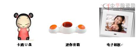 各种色彩丰富、小巧别致的电子产品也得到市场的青睐,手机、MP4、礼品U盘、笔记本、吹风机等商品被当成礼品赠送。卡通造型的U盘、闪亮的数码相框、迷你音响等产品精彩纷呈,以更丰富的功能、充满艺术情趣的外观设计扮美家居生活。