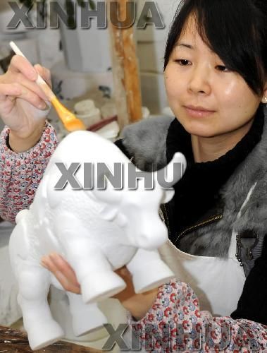 3月11日,德化县一家陶瓷企业的女工在刷洗用于灌装台湾金门高粱酒的牛形瓷坯。