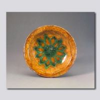 首都博物馆藏。葵口,折沿,弧腹,圈足,足内无釉,内外施黄釉,盘内心刻团花,施绿彩。内心有三个小支钉痕,外壁有轮制痕迹,胎体呈白色,釉面莹亮,有细碎开片。