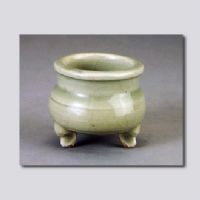 首都博物馆藏。折沿,直口,束颈,鼓腹,平底,下承以三兽足。通体施青釉,釉面光洁莹润有大开片,造型小巧别致。