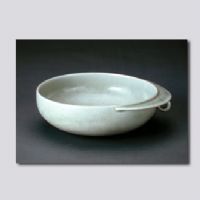 首都博物馆藏。直口,弧腹,卧足,口沿侧附月牙形鋬耳,耳下附环形系。内外施月白色釉,细润光亮。