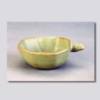 首都博物馆藏。八棱形。敞口,斜腹,平底无釉。口沿一侧有一龙首形小柄。内外施青釉,釉面光润,呈青绿色,玻璃质不强,有细密开片。胎质细腻,露胎处泛黄。