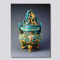 首都博物馆藏。仿汉代博山炉式样。陶胎。直口、短颈、丰肩、鼓腹,腹下承三兽足。颈部两侧饰对称桥耳,盖与炉用槽口衔接,炉体镂空。炉盖镂雕成层峦叠嶂的山峰,黄色蟠龙蜿蜒穿行于蓝色的山崖间,神态刻画生动。炉身遍体浮雕花枝、云朵。腹部一侧雕昂首展翅的飞凤,一侧雕回首凝视的蟠龙,飞凤和蟠龙相逐游翔于以蓝、绿、白色相间装饰的枝叶茂盛的缠枝牡丹花丛中,显得格外醒目。通体饰孔雀蓝、草绿、黄、白诸多色彩。镂雕工艺与绚丽的色彩相结合,呈现出华丽的装饰效果。