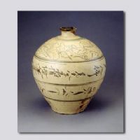首都博物馆藏。小口,短颈,丰肩,鼓腹,平底。4道弦纹将纹饰分为3部分,肩部用黑彩绘婴戏莲纹,下腹绘折枝花卉,中腹部题草书七言绝句诗一首:“寻慎悟入蓬莱捣(岛),香花不断松花老。采芝何处未归来,白云满地无人扫。至元十八年。”黄褐色釉,胎质较粗。现存元代用诗文作装饰并有年款之器甚少,弥足珍贵。