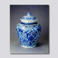 首都博物馆藏。直口、短颈、丰肩、腹下收、近底处微撇、砂底,隐圈足,宝珠钮盖。盖面与器身绘缠枝牡丹纹,颈部绘变形莲瓣纹。釉面光润,青花色泽浓艳,纹饰粗犷饱满,造型古朴厚重。此种罐亦称将军罐,因罐盖形似将军盔帽而得名。初见于明代嘉靖、万历时期,至清代顺治、康熙时期发展成为一种定型的罐式。