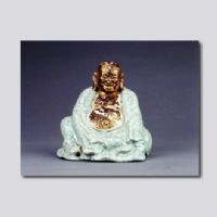 首都博物馆藏。此尊方头大耳,笑容可掬。身披通肩袈裟,袒胸鼓腹,头和胸腹处均涂饰金漆,袈裟上施仿哥釉,满布开片,自然形成田子格,宛如自然的“田相”。