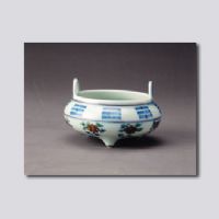 此炉仿明成化斗彩。炉下部绘折枝莲花,彩色浅淡,近于成化;而上部绘八卦纹,属道教图案,反映出嘉靖时期的纹饰特征。