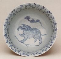 说 明: 撇口,深腹,圈足。内外釉下均绘青花,青花色泽青中略偏灰色。