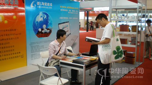 中华陶瓷网工作人员向现场客商发放陶瓷之路杂志,中华陶瓷网宣传资料