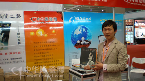 中华陶瓷网工作人员向现场客商发放陶瓷之路杂志,中华陶瓷网宣传资料