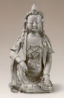 说 明: 此观音像戴冠穿衣,前胸袒露饰以缀珠,作半盘腿趺坐状,两手搁于膝部,呈不同姿态,体态丰腴,神态安详。