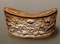 说 明: 此枕胎质细,釉白中泛黄,枕呈元宝形。