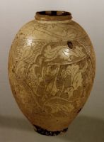 说 明: 通体施透明釉,肩部刻花叶纹,腹用开光构图。