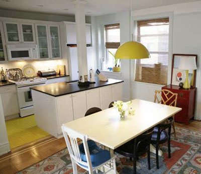 厨房、餐厅和客厅的家具无论是订做还是购买,式样一定要选择简单,切忌选择雕刻繁琐的中式家具、藤编、柳编类家具和布艺沙发及餐椅。这是为了防止沾染油污,便于清洁。开放式厨房的台面不应放过多的炊具,以保证其美观性。